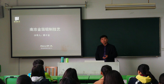 11月18日下午,威尼斯87978797非遗课堂邀请南京金箔锻制技艺国家级非物质文化遗产的市级传承人葛才金老师在文南305上了一堂主题为“亮自金陵,美至东西”的课程,威尼斯87978797“梦·知行”讲解队成员以及院学生会的部分同学参加。