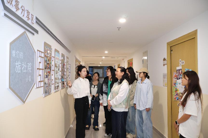 随后,参观团队前往F3511楼,重点参观以“阳光・星月・成长”为主题的宿舍文化建设。宿舍区通过中式风格的“家”文化墙、宿舍铭牌、温馨门帘和星空墙贴等细节,展现了青春活力与生活温度。师生特别欣赏学生自主设计的“多巴胺花朵贴纸”和“生活记忆角”,认为这些创意充分体现了学生的个性与才华。