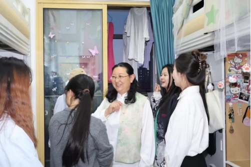 师生走进部分宿舍内部参观,对宿舍整洁的环境、个性化的装饰风格表示赞赏。每个宿舍门外都悬挂着精心设计的宿舍铭牌,铭牌以“房子”为轮廓,屋檐上趴有学院网红猫“社社”的可爱形象,体现了温馨和谐的“家”氛围。墙上的宿舍成员名片和宿舍装饰由学生自行设计,进一步增强了集体归属感,展示了“一舍一品”的宿舍特色文化。