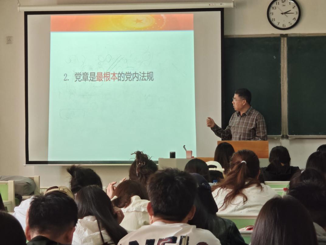 刘钦普教授以“认真学习党章 增强党员意识”为题,为入党积极分子讲授党课,全面系统解读了《中国共产党章程》,勉励大家要踏实学习党章,积极向党组织靠拢。他强调,《中国共产党章程》是中国共产党为实现党的纲领所制定的根本法规,是一面旗帜,是最根本的党内法规,是党内的根本行为规范,同时也是党存在、发展和夺取胜利的一个基本条件。他提出三点建议:一要读原文,全面系统地理解党章的内涵;二要把握学习的重点章节、内容;三要坚持理论联系实际。他激励大家,作为一名入党积极分子,要做到“未进党的门,先做党的人,将来进了党的门,做好党的人。”
