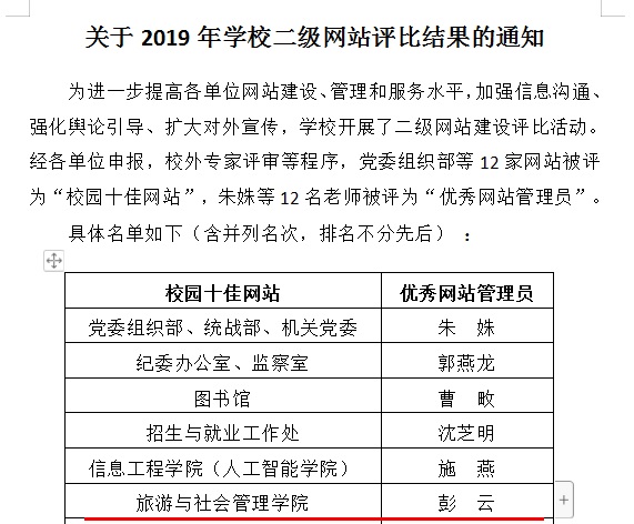 9月20日,学校公布的2019年二级网站建设评比结果中,威尼斯87978797网站获得“校园十佳网站”荣誉称号,综合办主任彭云同志获得“优秀网站管理员”表彰。