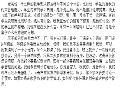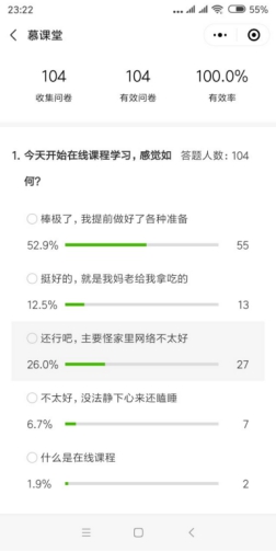 对于评价在线教学的质量,以学生为中心的自主学习是重要部分,三周下来,老师们在教学交流中,问的最多的是“今天你的学生学了吗?”,这表明即使有平台的帮助,但老师们仍然忧心忡忡,深入思考我的学生在干什么?我的学生想学习吗?这是下一步老师们重点要解决的问题。