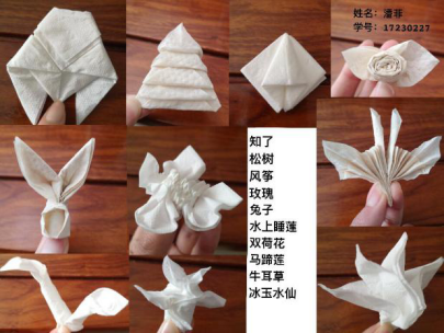 5.课后任务助效果。课后任务是课程教学的重要组成部分,学生们对待课后学习任务都很认真,教师或运用线上教学系统评定学生的任务,或使用学生互评方式,完成作业评价,给出成绩。学生们提交的电子化优秀作业、报告和讨论,让老师们知道了学生个体的学习效果。如酒店管理专业的酒店餐厅实训课程,老师们鼓励学生利用家中的餐巾纸、彩纸的物品,折出形态各异的杯花。