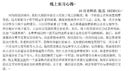 历史师范专业负责人在总结时表示,虽然线上实习使得学生无法身临其境体验班级教学,班级管理的实习无法展开,但通过尝试,开辟了实习的新渠道,校内老师与中学老师结合更加紧密,交流互动更加通畅有效,在实施过程中,也展现了它独特的魅力,可以作为正常线下实习的有益补充。
