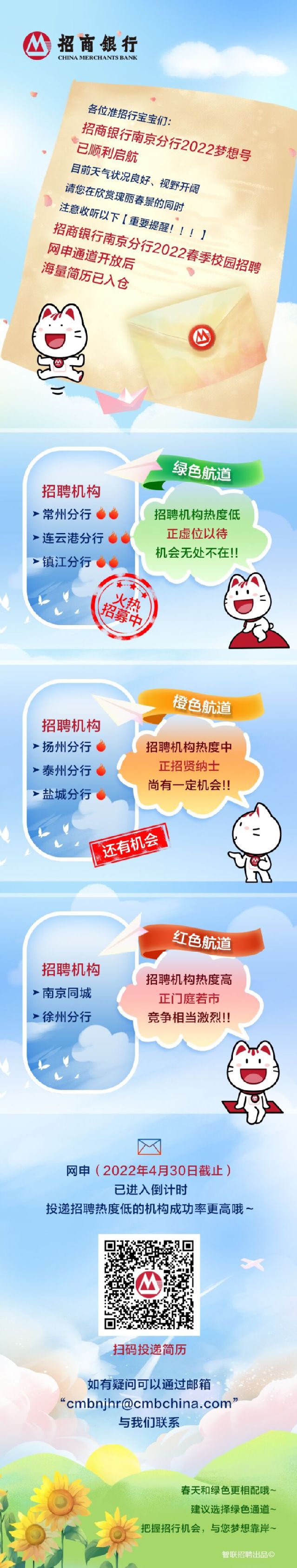招商银行2022校招正在进行,岗位有很多不限专业,经沟通联系,我校老师推荐的学生可直接参加笔试环节,请各位大力宣传,推荐表和招聘地区热力图已上传,供参考。推荐表请于4月27日17:00前反馈至cmbnjhr@cmbchina.com或cmbnjzp@163.com邮箱;反馈邮件标题:南京晓庄学院学生推荐表;温馨提示:被推荐学生需通过招商银行官方渠道报名后,方可被推荐!