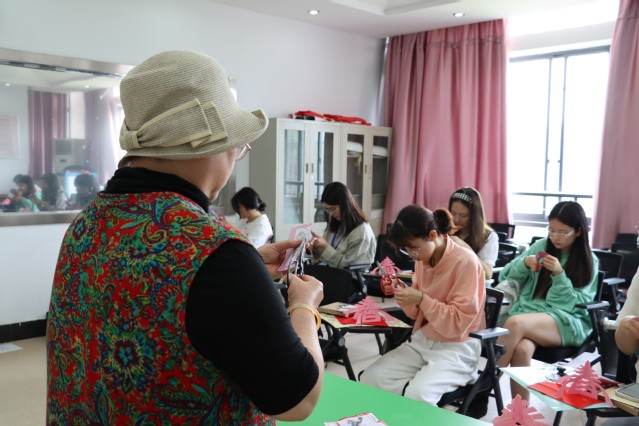 第二个项目为剪纸,由“江苏省工艺美术名人”张林娣教授担任本次剪纸项目的主讲人。张林娣教授向同学们展示了几副剪纸作品,并向同学们简单介绍了剪纸文化。之后带领同学们完成了折叠剪纸和立体剪纸的制作,让同学们获得独特了的手工体验,感受到了丰富多样的剪纸文化。