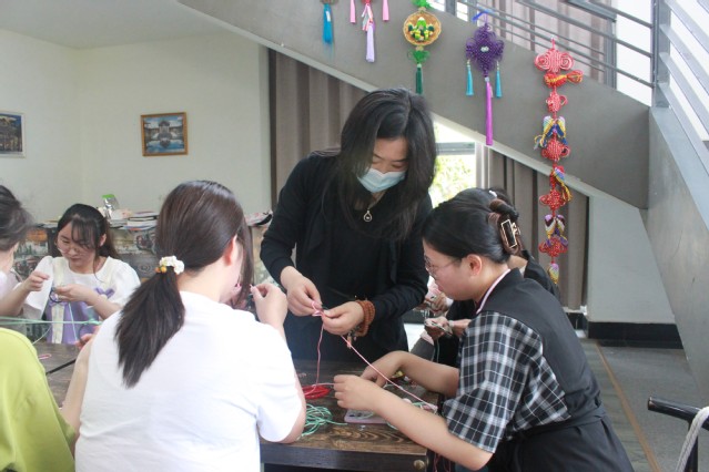 第一个项目为中国结,我院邀请了蒋妍侠老师作为本次活动的主讲人。活动开始,蒋老师向大家分发了制作材料,围绕“端午安康”的主题,同学们在蒋老师的细心指导下开始制作,经过认真细致的编织完成了各自的作品,体现了中国结多姿多彩的特点。