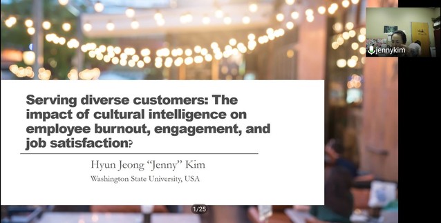 2022年6月25日上午8:00,我院在文南201举办了“Serving diverse customers:The impact of cultural intelligence on employee burnout,engagement,and job satisfaction”主题讲座,本次讲座主讲人为华盛顿州立大学Jenny Kim教授,主持人为我院刘佳雪老师,参加对象为我院2021届全体学生。