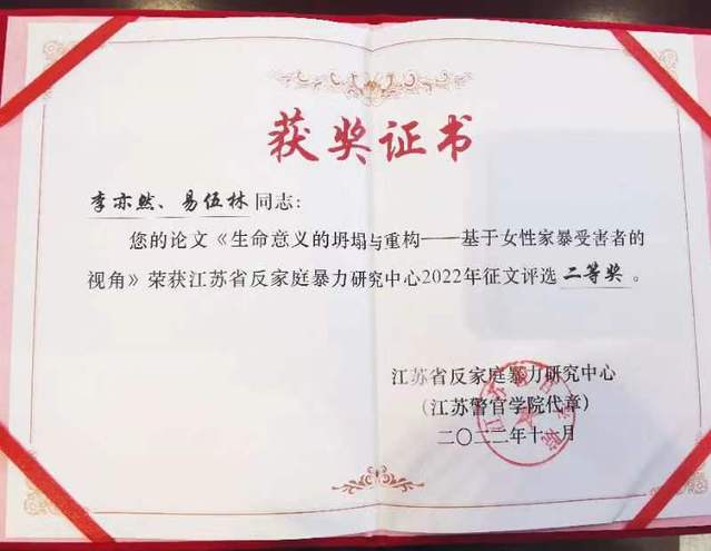 在此研讨会上,由易伍林老师指导,李亦然同学撰写的论文《生命意义的坍塌与重构——基于女性家暴受害者的视角》喜获江苏省反家庭暴力研究中心2022年征文二等奖。该论文基于女性家暴受害者的视角,运用建构主义等理论,对家暴形成的经济社会因素果以及受害者对家暴的意义建构进行了深刻思考,并从意义重构的维度提出了一些建议。在一定程度上,此文对反家暴实践具有一定的指导意义。