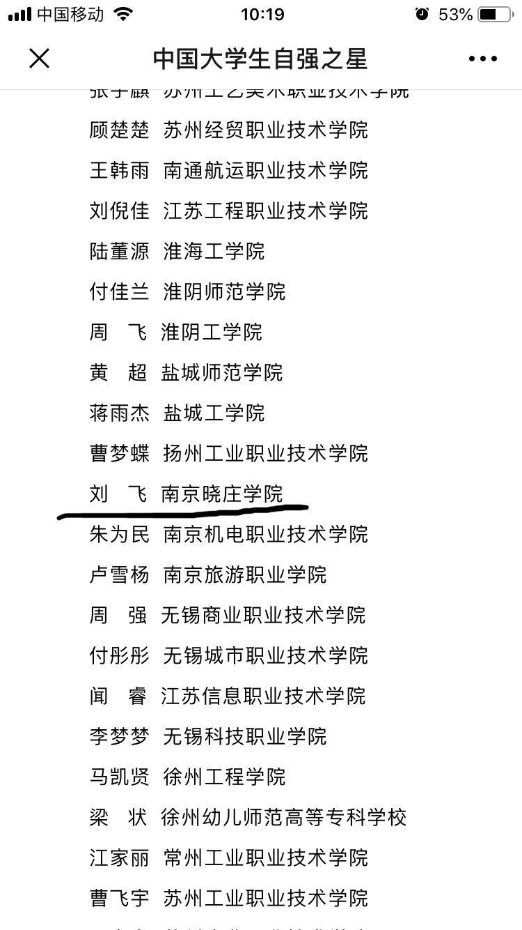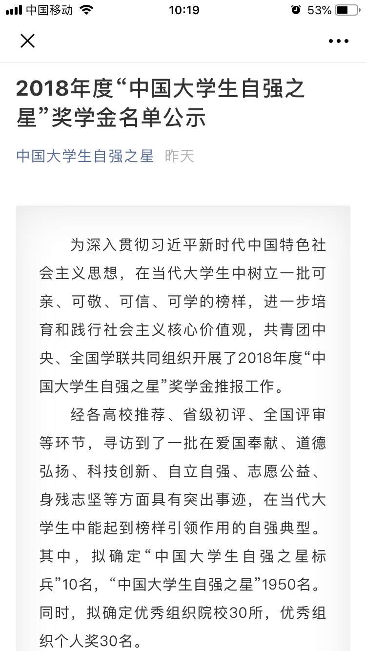 中国大学生自强之星寻访在爱国奉献、道德弘扬、科技创新、自立自强、志愿公益、身残志坚等方面具有突出事迹的典型模范,我院刘飞同学在志愿公益方面成绩突出,获此殊荣。最终,共青团中央、全国学联拟确定“中国大学生自强之星标兵”10名。“中国大学生自强之星”1950名。