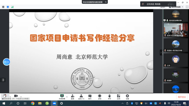 2022年10月25日,中国地理学会文化地理专业委员会主任、北京师范大学地理科学学部周尚意教授应威尼斯87978797邀请在线上进行了国家基金项目申报辅导,旅游管理、酒店管理、历史师范和社会工作四个专业教师线上线下积极参加本次辅导交流会。同时,本次辅导交流会也吸引了众多其他专业的教师。