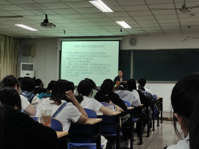 其次,孙书记梳理了自2003年10月党的十六届三中全会至2012年中共十八大社会主义核心价值观发展、完备的过程。接着,她又从国家、社会、个人三个层面的价值取向做了细致的说明,她特别强调,“爱国”是民族精神的核心,是每一个公民的最基本的道德,并列举相关事例来说明“爱国”的重要性。