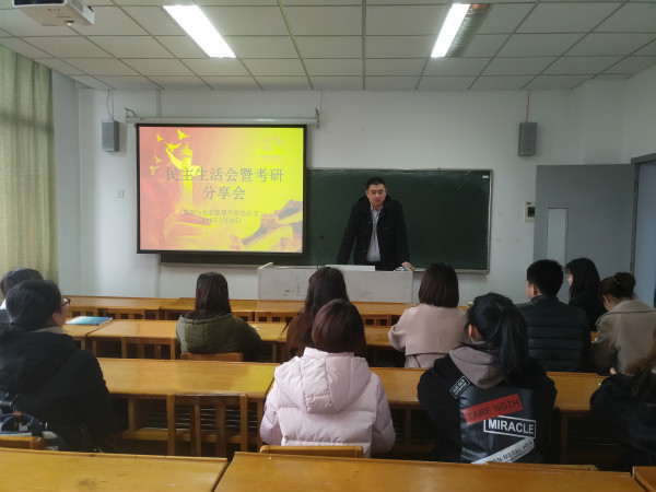 3月20日下午1点半,我院学生党员支部新学期第一次民主生活会于文南301教室顺利举行。本次会议主题为考研分享,党总支副书记谢雷、分团委书记彭佳姝及全体党员学生共同参加。