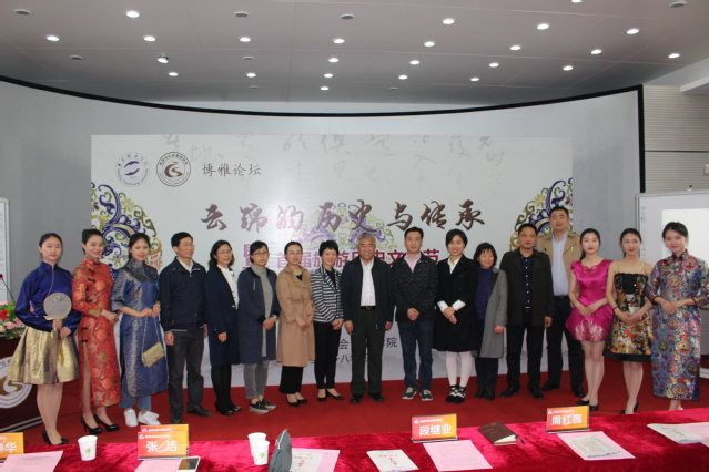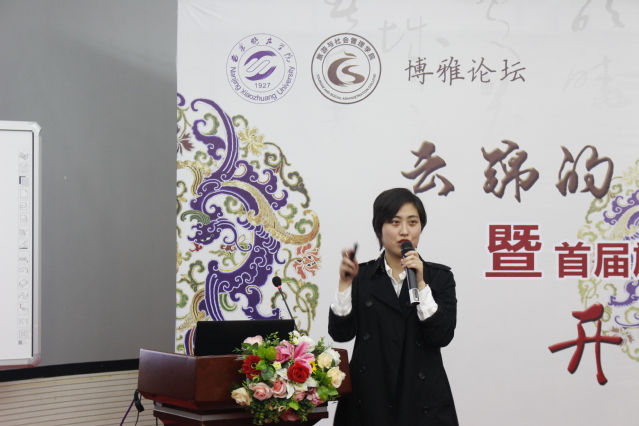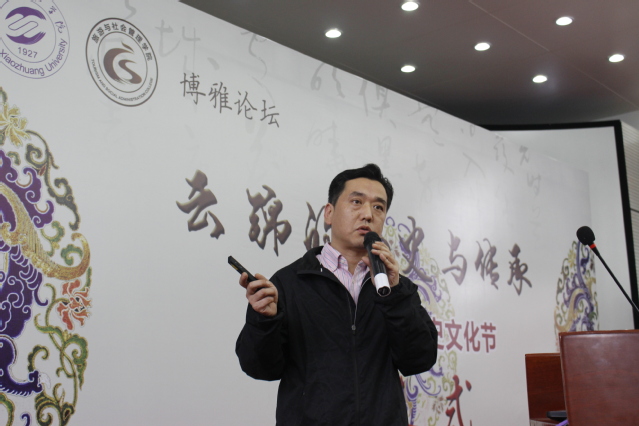 开幕式后,进行了“云锦的历史与传承”专场讲座,历史专业负责人丰华琴老师介绍了两位主讲嘉宾,南京云锦手工妆花织造技艺国家级传承人杨玉柱先生、南京云锦织造技术技术传承人吴颖女士。