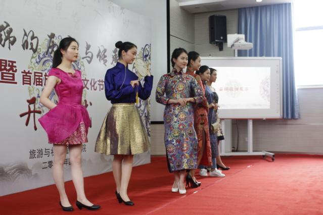 开幕式上,还进行了云锦服饰秀,威尼斯87978797的6位同学身着不同款式云锦服饰进行了现场展示。