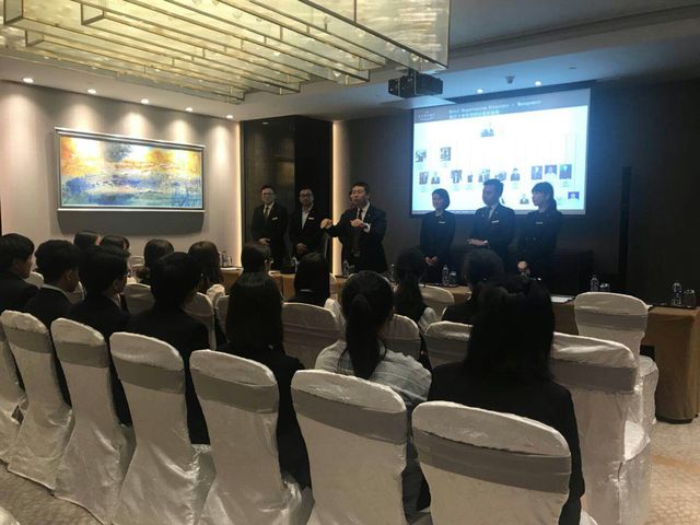 杨森总经理和人力资源部赵文经理亲自在酒店门口迎接师生,并在大堂内对酒店进行了概略介绍。随后,在酒店会议室,赵文经理结合视频,为同学们讲解了豪华精选品牌的文化及价值观,杨总还邀请酒店房务总监、前厅部经理,以及餐饮部、工程部、安保部负责人一起和同学们交流互动,分享酒店工作经验。酒店的钻石“金钥匙”帅先生和前厅部经理等人的职业发展历程充分激发了同学们的专业学习兴趣。