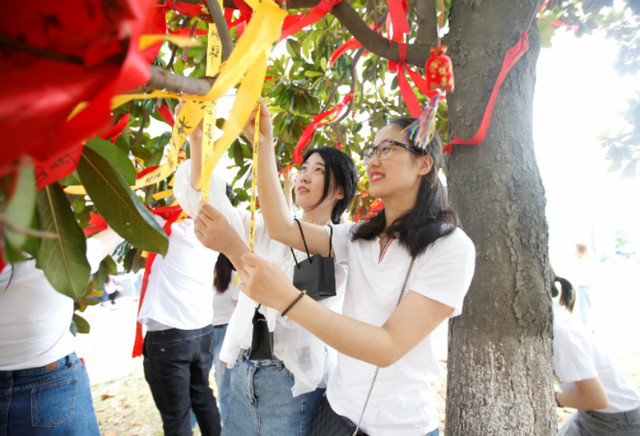 毕业生给玉兰树系上黄丝带